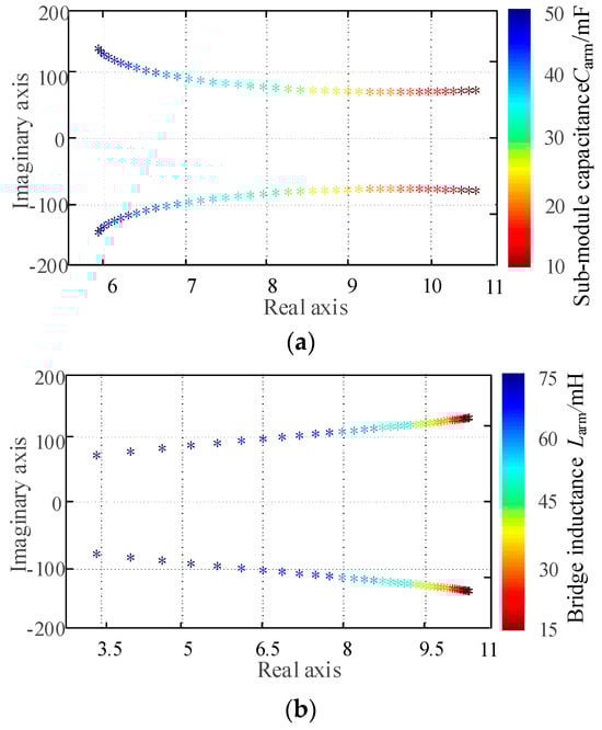 The influence of MMC subsystem operating parameters on oscillation mode. (a) Effect of submodule capacitance Carm on oscillation mode. (b) Effect of bridge inductance Larm on oscillation mode.