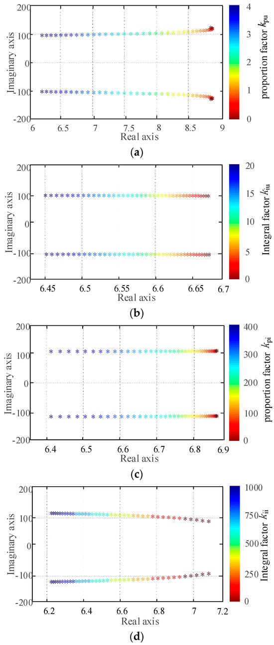The influence of MMC sub-system control parameters on oscillation mode. (a) Effect of proportion factor kpu on oscillation mode. (b) Effect of integral factor kiu on oscillation mode. (c) Effect of proportion factor kpi on oscillation mode. (d) Effect of integral factor kii on oscillation mode.
