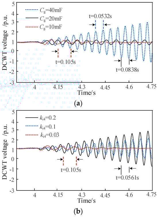 DCWT voltage waveform plot when system parameters change. (a) Effect of changed kpu on DCWT voltage. (b) Effect of changed ki4 on DCWT voltage.