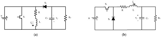 In Figure 2, schematic diagrams of the Buck and Buck–Boost converters feeding a resistive load are recalled from [16], where and , respectively, stand for the inductor current and the capacitor voltage. In Figure 2, S1 is the power electronic switch and S2 is the diode, where C0 is the stabilizing capacitor, which decreases the voltage fluctuation across the load and lets the ripple current pass through, hence maintaining the constant current flow across the load.