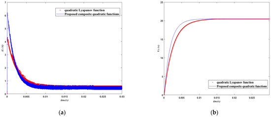 In this formulation, represents an attainable equilibrium point, and the matrices of each subsystem Qi have compatible dimensions. Additionally, the set of all equilibrium points is determined through the proposed switching strategy. The performance index in Equation (2) penalizes the weighted deviation of each state variable from the desired equilibrium point. The inherent challenge in solving this control problem arises from the discontinuous nature of the switching function . Consequently, instead of directly addressing this complexity, the focus is on minimizing the upper bound of the performance index , characterized on the right-hand side of Equation (3):