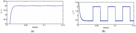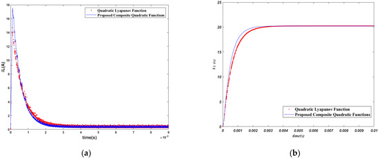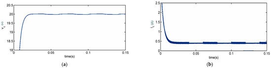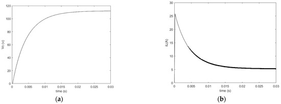 Time responses of the states in the Buck–Boost converter are shown in Figure 3 for . As seen, the transient behavior of the suggested converter is noticeably faster than the one developed in [16]. More specifically, settling times of the outputs in the proposed converter and the rival one in [16] equal, respectively, 8.5 and 9 ms.