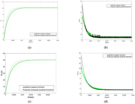 Figure 4 depicts the time response of the states of the Buck converter for . As can be seen, the transient response of the suggested converter is faster than the one proposed in [16].