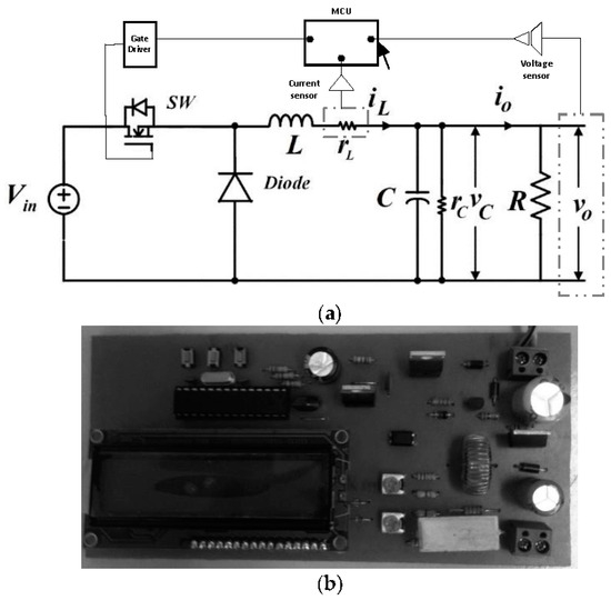 Schematic diagram of Buck converter (a) and developed experimental prototype of Buck converter (b).