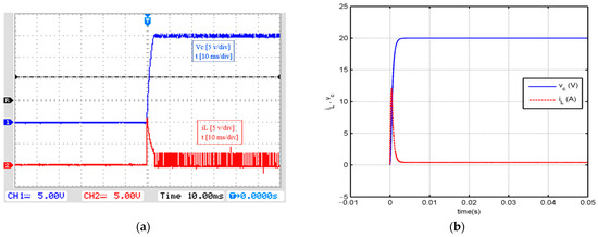 Waveforms were captured utilizing a digital oscilloscope. Figure 10 displays the measured response of the converter capacitor (output) voltage and inductor current waveforms, along with the corresponding simulation results.