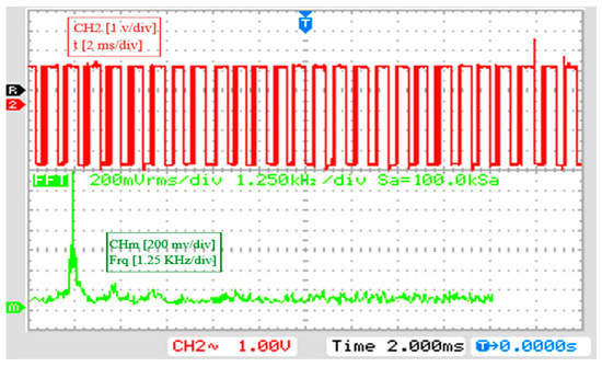 Experimental results of the steady-state switching signal and its FFT (CH2: Switching Signal, CHm: Output Voltage).