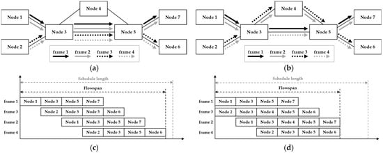 However, this approach overlooks the scheduling performance, which is a primary goal in TSN. Figure 1 illustrates the paths routed using different methods in the same topology, along with their corresponding schedules. In (a), the path is routed using the shortest-path algorithm, whereas in (b), the traffic is distributed. Furthermore, (c) and (d) show the schedules for the shortest-path algorithm and distributed traffic, respectively. The ‘flowspan’ in each schedule table suggests a performance metric for NW-PSP, indicating the time required for a frame’s transmission to complete within the schedule duration.