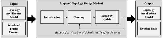The proposed topology design method comprised three main stages: initialization, routing, and topology update. In the initialization stage, the graph model used for the topology design was initialized. In the routing stage, K-paths were generated using Yen’s KSP. After placing ST frames in the schedule table using K-paths, the method selected paths with the potential to optimize the scheduling performance, considering the maximum traffic and transmission completion time. Then, the selected paths were used to update the topology, thereby completing the topology design.