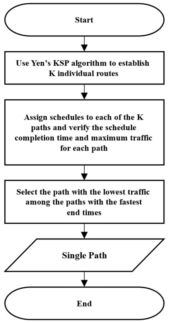 Algorithm 2 shows the pseudocode for the function used to create a single path. Figure 3’s flowchart visually depicts the process. It used Yen’s KSP to generate k-paths and selected one of the k-paths to create the path. Yen’s KSP routed k-paths by considering the topology cost and hopping of paths. Using route R obtained from routing, we generated a single transmission schedule for the frames and calculated the maximum traffic for each path. Schedule and traffic were stored in as a set of paths. The maximum traffic on a path was that of the port with the highest traffic among the transmission ports of the switches comprising the path.