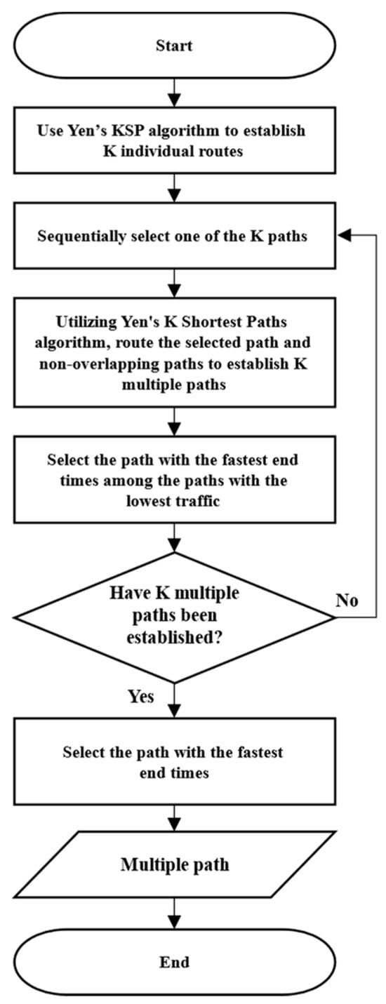 Algorithm 3 shows the pseudocode for the function, which created redundant paths. Figure 4’s flowchart visually depicts the process. Here, k-paths were created using Yen’s KSP. Redundant paths were created based on the paths in created path . Subsequently, the path with the fastest transmission completion time in the first cycle of k-paths was selected. The selected path and transmission schedule for the selected path were the output.