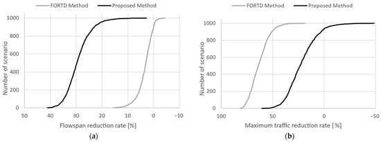Figure 5 shows the reduction ratios of the flowspan and maximum traffic reduction for the proposed and FORTD methods compared with the YKTD method across the entire set of scenarios. For clarity, each graph sorted the metrics in descending order. The y-axis represented the number of scenarios, and the x-axis represented the performance metrics. Graph (a) shows the reduction ratio of the flowspan, and (b) shows the maximum traffic reduction.
