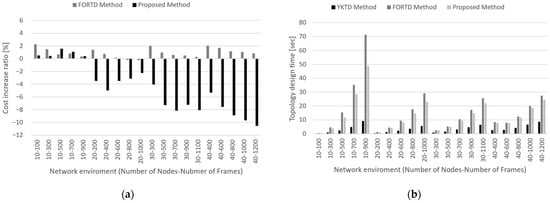 Results of topology cost and topology design time measurements: (a) increased topology cost measurement results of the proposed and FORTD method based on YKTD method and (b) topology design time of each method.