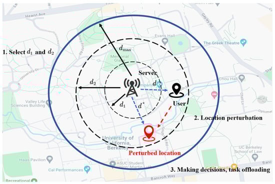 We assume that the MEC system consists of a MEC server and a user with mobile devices, similar to the work in [,]. The user’s offloading strategy takes into account the distance between the user and the MEC server, as well as the wireless channel conditions. In scenarios where the distance is short, and the channel quality is good, users are more likely to prefer a high offloading rate, offloading more tasks to the edge server to improve performance. Conversely, in scenarios where the distance is long, or the channel quality is poor, users may prefer a lower offloading rate, executing more tasks locally to reduce computational costs. In order to protect the user’s location privacy, we perturb the user’s real location into a fake location, and we perform task offloading through the fake location. The user’s location perturbation and the offloading process between the user and the MEC server are shown in Figure 1.