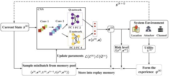 At time slot k, based on the current state , the user selects the location-privacy-preserved task offloading policy according to Equation (17). Then, the user executes the action = [, ] and obtains the system reward after evaluating the energy consumption, latency, and privacy leakage level. Then, the system state transfers to the next state .