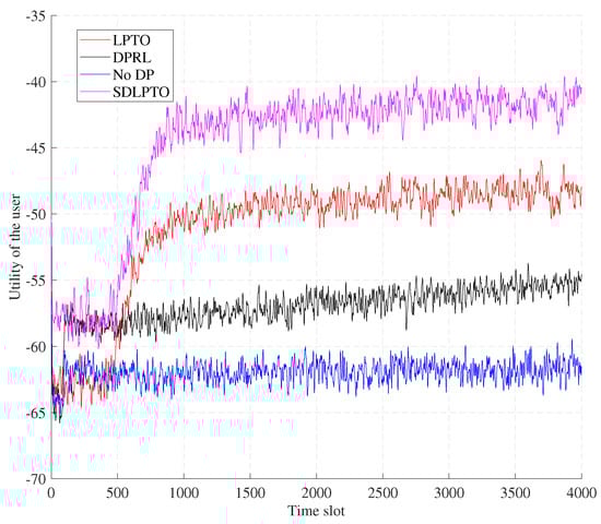 Figure 5 and Figure 6 illustrate the performance of the proposed mechanism versus time. From the figure, it can be seen that our proposed SDLPTO mechanism outperforms the No DP and DPRL mechanisms by reducing the privacy leakage level of SDLPTO by 18.2% and 11.2% at time slot 2000, reducing the computational cost by 33.1% and 35.2%, and improving the utility by 33% and 27.2%, respectively. This is because No DP does not consider location privacy, and DPRL only implements location privacy protection and offloading optimization separately; our proposed method jointly optimizes user privacy and computational offloading cost, effectively improving the overall user benefit. Moreover, compared with LPTO, SDLPTO reduces the privacy leakage level and computational cost by 7.7% and 26.7%, respectively, and improves the benefits by 9.1%. This is because safe exploration can avoid selecting operations with higher risk levels, thus reducing privacy leakage and computational cost.