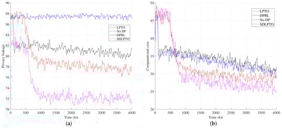 Computational cost and privacy leakage level versus time. (a) Privacy leakage level. (b) Computational cost.
