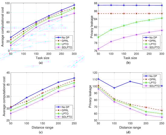 Figure 7a,b illustrate the relationship between average computational cost, privacy leakage, and task size for the four mechanisms. As the task volume increases from 50 Kbit to 300 Kbit [], SDLPTO exhibits a 6.0% increase in privacy leakage level and a 5.2-times increase in computation cost. This indicates that as the task scale grows, more computational resources are required to execute these tasks, leading to a significant rise in computation cost. Moreover, as the task volume increases, users tend to offload more tasks to edge servers, which entails greater collection and processing of location information data, potentially increasing the risk of location privacy leakage.