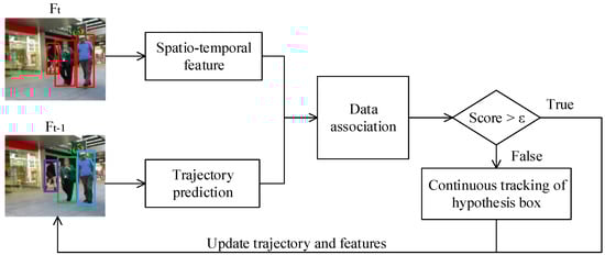 The flow chart for our method is shown in Figure 1. The red detection box in the Ft frame extracts the spatio-temporal features of the object, while the Ft-1 frame records the historical features of the object trajectory and can predict the position of the object in the Ft frame through Kalman filtering. We use spatio-temporal features and track prediction for data association to solve the problem of occluded object detection and multi-object tracking in severe occlusion situations. If the correlation matching score reaches the threshold, the tracking task is completed; otherwise, to deal with the reappearance of objects with complete occlusion, and the tracks recovery when the object is completely occluded again, the historical trajectory information is retained for continue tracking, and predict frames are as hypothetical frames for continuous tracking. Algorithm 1 presents how to use spatio-temporal features and track prediction to solve the problem of multi-object tracking in severe occlusion situations.