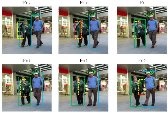 As shown by the yellow box in Figure 4, frame Ft−2 is a case of local occlusion, while frame Ft−1 is a case of severe occlusion. In the Ft−1 frame, the red solid box represents the object motion prediction box, and the yellow dashed box represents our hypothesis box. From Ft frame to Ft+2 frame, the continuous tracking mechanism for a hypothesis box is required. The prediction box is used as the hypothesis object box for continuous tracking until the object reappears in Ft+3 frame, which can retain the object identity and continue tracking, and then repair the complete tracks.