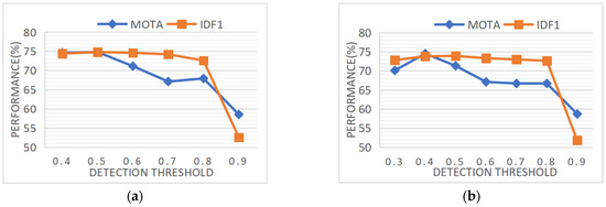 This section presents the experiment of selecting threshold for data association matching. In the tracking algorithm, if the score of data association matching is greater than the threshold, the matching is considered successful. Figure 6a shows the first data association threshold selection experiment. The horizontal axis represents the first data association matching threshold, and the vertical axis represents the percentage of tracking performance. This article mainly focuses on the results of MOTA and IDF1 for tracking performance, so the blue line represents the evaluation indicator MOTA, and the red line represents the evaluation indicator IDF1. From Figure 6a, under the same execution, MOTA achieves the optimal tracking accuracy, which far exceeds other thresholds, when the first data association matching threshold is selected as 0.6. Therefore, in this article, the data association matching threshold was selected as 0.6.