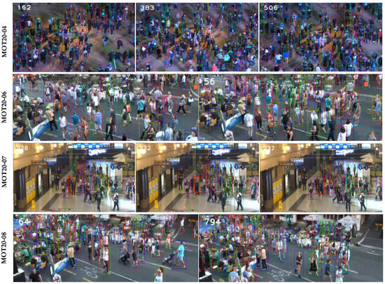 Figure 8 shows the visualization results obtained by our algorithm in tracking the MOT20 test set in the official MOT. We have bolded the borders for the objects that we are more concerned about, and the video frame rate is displayed with white numbers in the upper left corner. The object with ID 112 in the MOT20-07 dataset experienced local occlusion, severe occlusion, and complete occlusion before reappearing. The algorithm in this paper can continuously track the object and successfully detect and maintain the ID unchanged in severe occlusion situations. In other visualization results, it can be found that the method proposed in this paper can not only adapt to local occlusion situations, but also adapt to severe occlusion, complete occlusion, and long-term occlusion situations for object tracking, and restore severely occluded object detection while maintaining the identity of the object trajectory unchanged.