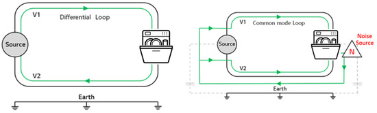 The noise generated during the on/off operation of the power switch is categorized into two types based on the transmission path of the noise. Firstly, differential mode refers to the voltage measured between the power lines (live/neutral) or the current flowing through the two lines [3]. This current flows only through the power lines without returning through the ground, ultimately resulting in the difference between the V1 and V2 lines. The transmission path of differential mode noise is illustrated in Figure 1. In this case, only the pure differential mode voltage, determined by the difference between V1 and V2, and the differential mode current, determined by the load impedance, flow through the load. Typically, the differential mode current flowing through the load is the current considered during circuit design and is used for the normal circuit functionality implementation. Therefore, the differential mode signal is also referred to as the normal mode signal.