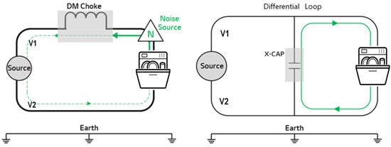 Noise paths of differential mode and common mode.