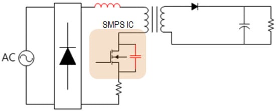 The primary power supply used for driving DC loads in household appliances is typically a flyback SMPS (switched-mode power supply) with a power rating of 100 W or less. In the case of a flyback SMPS, momentary voltage spikes occur during the power switch’s off state, leading to the generation of noise through high-frequency paths [4].