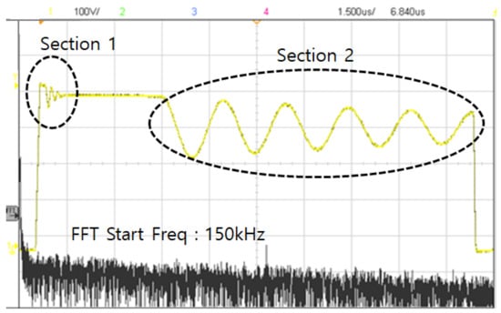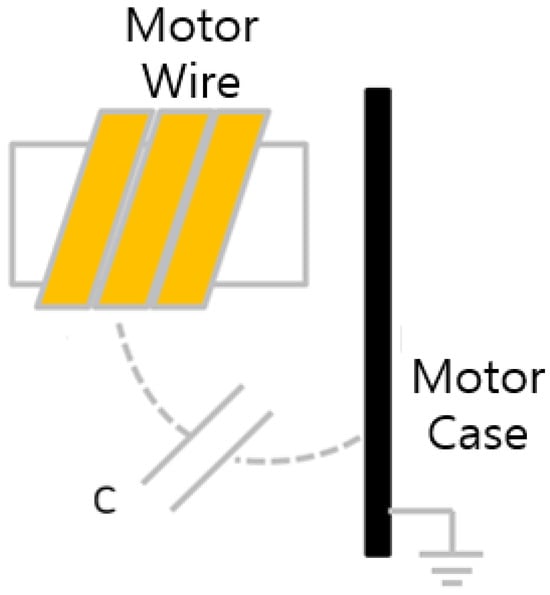 This parasitic capacitance can vary depending on the motor’s shape or winding method. Referring to the literature, assuming the motor’s shape is the same, it was confirmed that the resonance frequency varies according to the motor’s winding method (delta or star winding). For star winding [13], resonance occurs in the 50 kHz range, while for delta winding, it occurs in the 300 kHz range.