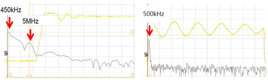 This subsection focuses on improving the noise generated by the washing motor, which has the most significant impact on the overall noise of the dishwasher, as shown in Figure 16 and Figure 17. Examining Figure 22, it was determined that the washing motor resonates at 450 kHz, causing high-frequency components of the motor switching voltage to flow to ground through the motor case. This component was identified as noise due to common mode current. To minimize common mode current, the impedance of the three-phase core was optimized to be highest at 450 kHz, considering cost and size constraints.