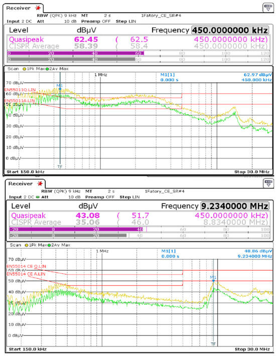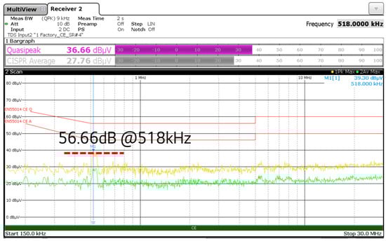 In the case of CE, a clear improvement in noise was observed in the 300 kHz to 600 kHz range and at 10 MHz. Furthermore, a margin of more than 10 dBuV was secured compared to EMC standards (EN66014). The CE measurement results after the improvement are shown in Figure 21. Before improvement, the maximum value was approximately 65.99 dBuV at 9.74 MHz, but after improvement, it reached a maximum of 40.72 dBuV at 9.05 MHz [17,18,19].