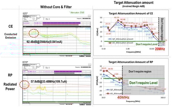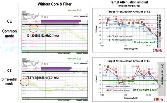To analyze and derive improvement directions for accurate EMI countermeasure design, the current EMI levels (CE, RP) were measured with the existing EMI design removed. Additionally, to identify EMI countermeasure directions, measurements were taken for the common mode (CM) and differential mode (DM) [8,9].
