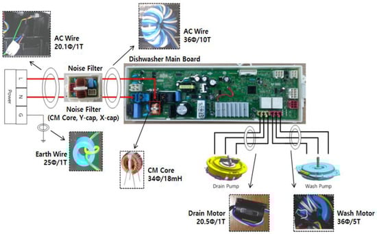 We analyzed the CE of EMI and divided it into CM and DM after removing the EMI countermeasures, and the results are shown in Figure 11. The measurement results indicated the need for simulation measures for CM and DM noise at 150 kHz. In the frequency range up to ~30 MHz, it was observed that the CM values were larger than the DM values, and the maximum target attenuation was measured at 51 dBuV@362 kHz. Considering that CM noise dominates in the target model, it was determined that EMI countermeasures are needed by identifying the path of noise leakage from the load first [10,11]. For CM components, this is generated due to the loop between ground and the power supply. A typical form of ground core is applied to the main load (washing motor) of the dishwasher product. The current location of the harness core is shown in Figure 12.