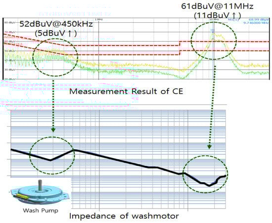 We present the common impedance of the washing motor connected to the product’s ground and the EMI results of CE in Figure 13. Examining the common impedance of the washing motor in Figure 13, resonance is observed at 450 kHz and 11 MHz, and it was confirmed that the actual EMI values are much higher in these frequency ranges. Additionally, the major noise paths of the entire system, as shown in Figure 12, are schematically represented in Figure 14 [12].