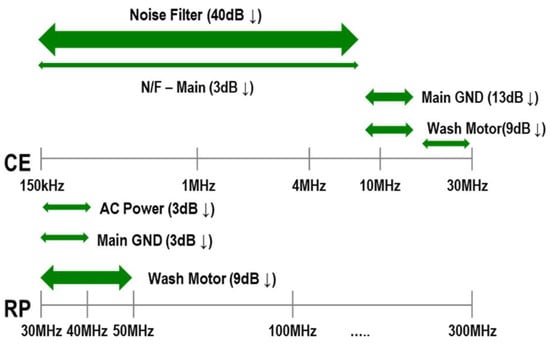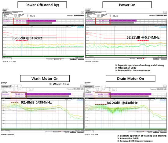 The CE measurement results in Figure 24 are the results of testing after removing all ferrite cores applied to the harness except for the noise filter and applying the washing motor core [14,15]. The improved three-phase common mode core showed a significant improvement effect of over 20 dB at 450 kHz and had a margin of over 5 dB across the entire CE frequency range. Additionally, by examining Figure 25, it can be seen that the noise in the 30 MHz range of the RP band is reduced by more than 10 dBpW after the improvement.