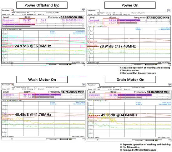 Furthermore, due to the drain motor drive, there was an increase of 29.6 dBuV and 33 dBuV in the same frequency range. In the RP domain, there was a 4 dBuV increase during main PCB Assembly power activation, while during the washing motor operation, there was an increase of 15.4 dBuV, and during the drain motor operation, a 24.2 dBuV increase was observed at 40 MHz.