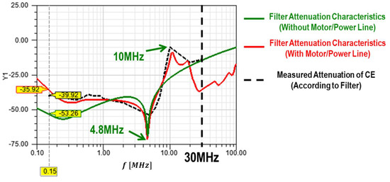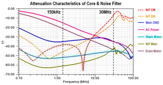 Based on the modeling data of individual components, we validated the modeling and attenuation characteristics of system components such as the washing motor and power input lines. The analysis of the attenuation characteristics of the noise filter depending on the presence of the motor and power lines is illustrated in Figure 21.