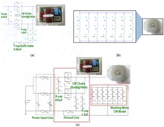 Circuit modeling of mass-produced noise filter components and individual external core components: (a) noise filter; (b) washing motor; (c) power input line.