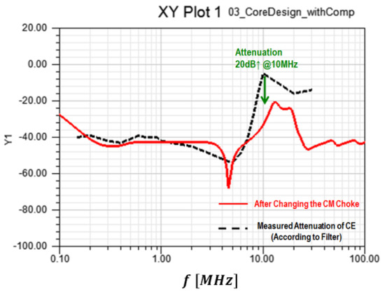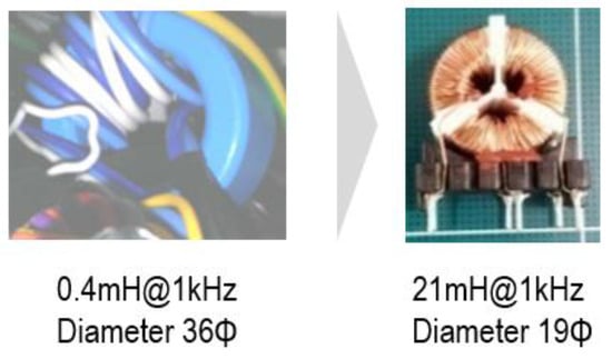 Meanwhile, the attenuation characteristics of the noise filter were compared with the existing measurement data, as shown in Figure 28 [16]. The system configuration with improved CE noise is illustrated in Figure 29. Additionally, the lightweighting of the noise filter CM core in the actual product can be observed in Figure 30.