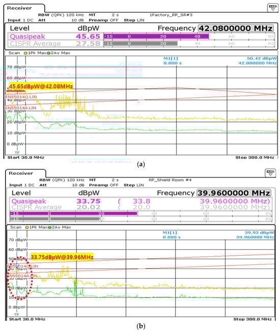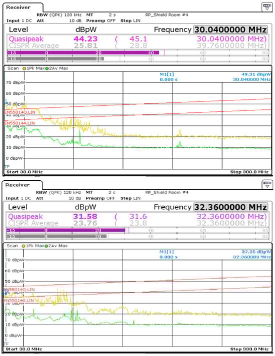 For RP, a significant noise improvement was observed in the 40 MHz to 50 MHz range, and a margin of more than 5 dBpW was secured across the entire frequency range compared to the standard level (EN55014). The RP measurement results after the improvement are shown in Figure 22. Before improvement, the maximum value was approximately 45.65 dBpW at 42.08 MHz, but after improvement, it reached a maximum of 33.75 dBpW at 39.96 MHz [20,21].