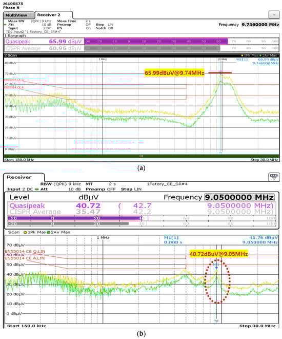 EMI (CE) measurement results: (a) before improvement; (b) after improvement.