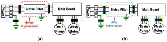 To suppress noise due to the resonance frequency of the washing motor, a common mode (CM) core designed for the resonance band was implemented on the printed circuit board (PCB). Subsequently, simulations were performed considering the washing motor and power input lines, and an EMI countermeasure design was implemented by optimizing the noise filter for radiated power (RP). Meanwhile, the application of a common mode core effectively reduced the overall system noise. However, due to the bulk design of the existing noise filter, lightweighting of the noise filter became necessary. Therefore, the rationale for noise filter lightweighting and the design approach were derived based on simulations and subsequently validated through experiments. In other words, initial efforts were directed towards realizing a reduction in the overall system noise, followed by the design of the noise filter, based on a simulation analysis for size reduction, and validation through experiments.