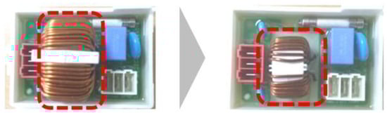 Therefore, in this paper, leveraging the occurrence of EMI noise at the washing motor’s common mode impedance resonance frequency, noise countermeasures were implemented proactively in the product design based solely on the motor information, as shown in Table 2. To attenuate EMI noise, a 3-phase common mode core was designed to increase the impedance of the filter, aligning it with the resonance frequency of 450 kHz.