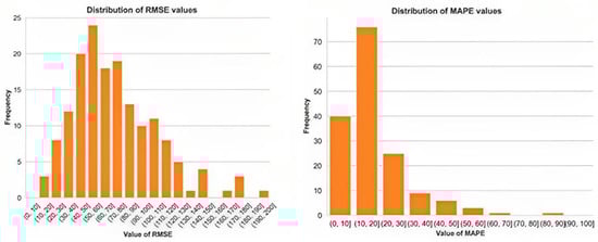 Distribution of RMSE (left image) and MAPE (right image) values.