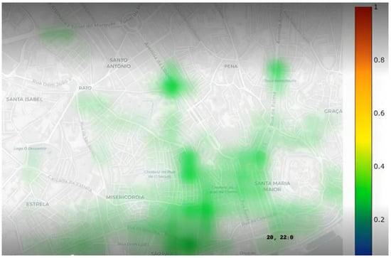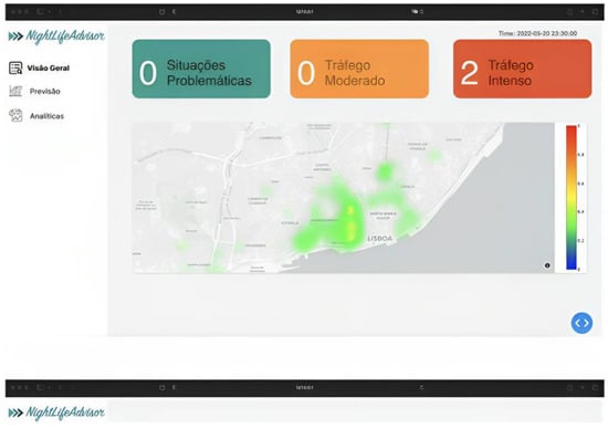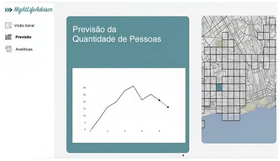 The dashboard contains a map of Lisbon’s nightlife areas, and the user may select the desired area to see the forecast of the number of people and past activity (see Figure 6). The dashboard also offers summaries and a detailed analysis of the movements in the last 12 or 24 h, as well as in the past 7 or 14 days.