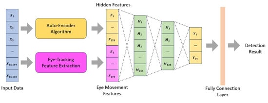 This study continuously adapted the structure of the auto-encoder model. Under the optimal performance, the structure of the auto-encoder model is a five-layer encoder structure. The length of the output implicit feature variables is 128 dimensions. This study used the implicit features as the output part of the auto-encoder algorithm. To combine the manually extracted eye movement feature data and the feature data learned by the model autonomously, we calculated the eye movement feature data in the deep learning dataset using the experimental eye movement feature calculation method. The eye movement feature computation used the standard definitions of fixation and saccade, using time data and pupil size data to compute pupil-related features, and using time data and fixation point data to compute eye movement features and task performance features. In the calculation of pupil-related features, we recorded the start of a blink as the time when the pupil size plummeted below 200 pixel points. Based on this, we concatenated the two types of feature data and used the auto-encoder model for further feature extraction and the eye fatigue detection task, which had previously performed the best. We adjusted the structure of the whole model, especially the auto-encoder structure at the back and the length of the further extracted implicit feature vectors. Finally, we chose a two-layer auto-encoder with 64-dimensional implicit features, and its overall structure is shown in Figure 2.