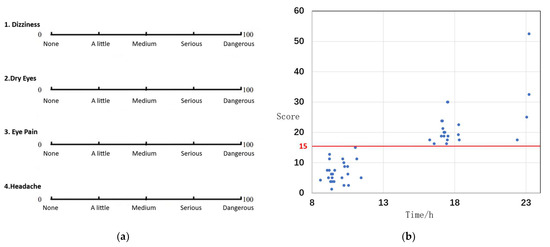 Considering the ease of use and relative objectivity, this study adopted the “Visual Fatigue Testing and Assessment Methods for Display Terminals—Part 2 Scale Assessment Methods” published by the China Video Industry Association (CVIA) on 19 July 2019 as an eye fatigue assessment scale, No. T/CVIA 73-2019 [37]. This scale has been widely used in fatigue studies at home and abroad and has performed well in terms of accuracy and reliability. The scale contains a total of 20 questions covering the three major ocular mechanisms of eye fatigue. The questionnaire focuses on the subjective perception and visual condition of the eyes, including questions on eye fatigue, eye tightness, eye tearing, dry eyes, eye pain, and blurred vision, supplemented by questions on vertigo, headache, and neck pain, which are affected by extra-ocular mechanisms. In contrast, questions about the attentional mechanisms caused by eye fatigue were answered by the subjects based on their current sensations, such as difficulty concentrating, slow thinking, distraction, unresponsiveness, and lethargy. To quantify and differentiate the level of fatigue of the subjects in this paper, the scale gives five levels for each question for the subjects to choose from, corresponding to a score of 0, 25, 50, 75, and 100, respectively.