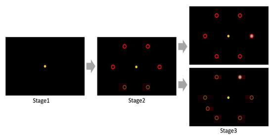 The second phase was the pre-search stage, in which six red circles with a radius of 30 pixels and a thickness of 2 pixels were generated around the center dot, based on the screen from the first stage. In this phase, subjects were still asked to look at the center of the screen, and the focus of attention and pupil movements were examined for a total of 2 s when the screen changed.