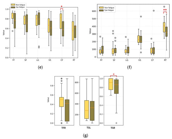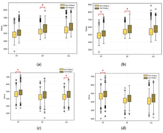 Pupil-related features performed better in the analysis of variance of repeated measures of variance, especially the maximum and minimum pupil sizes. In the data analysis, maximum pupil sizes showed a significant difference in the slow flicker task where the screen became brighter, as well as in the fast flicker and slow flicker tasks where the screen became darker. Meanwhile, minimum pupil sizes also showed significant differences in the screen-brightening in the fast flicker and luminance gradient tasks, as well as in the screen darkening in the fast flicker task. In addition, both features showed near-significant differences in other tasks and other situations, which perhaps related to the number of data. This phenomenon suggests that as eye fatigue increases, pupillary control by the pupillary sphincter and pupillary dilator muscles decreases significantly and the pupil dilates accordingly. Therefore, changes in pupil size is one of the reliable ocular motility features of eye fatigue. In contrast, mean velocity of pupil changes and response time for the pupil to adjust to screen changes performed poorly and did not show significant differences. Overall, although there were no significant differences in some of the pupil-related features, they were still relatively well-performing eye movement features that can be used as discriminators of eye fatigue.