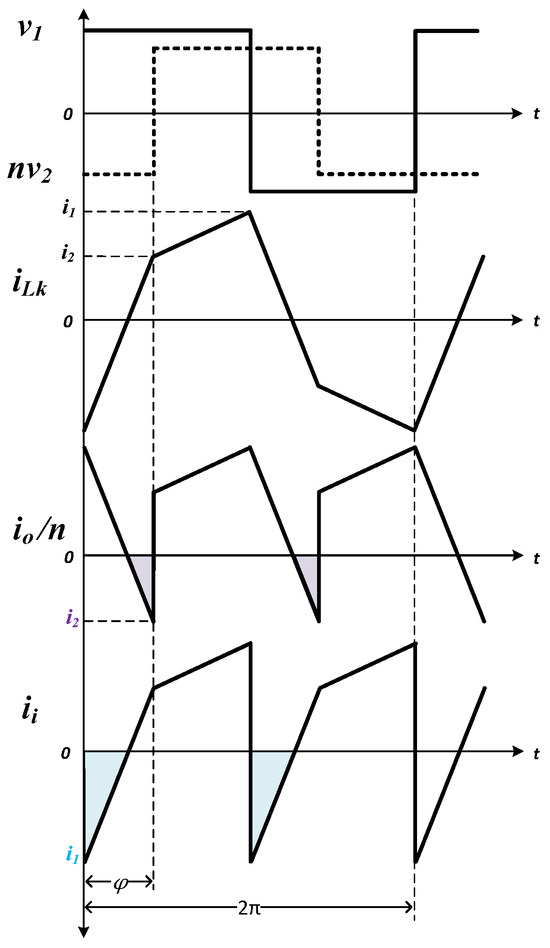 The output and input current waveforms, and , respectively, are shown in Figure 2, where the shaded area represents the reactive currents, with its value at the switching instant of the corresponding FB shown in its respective color. The reactive currents are discussed in the next section.